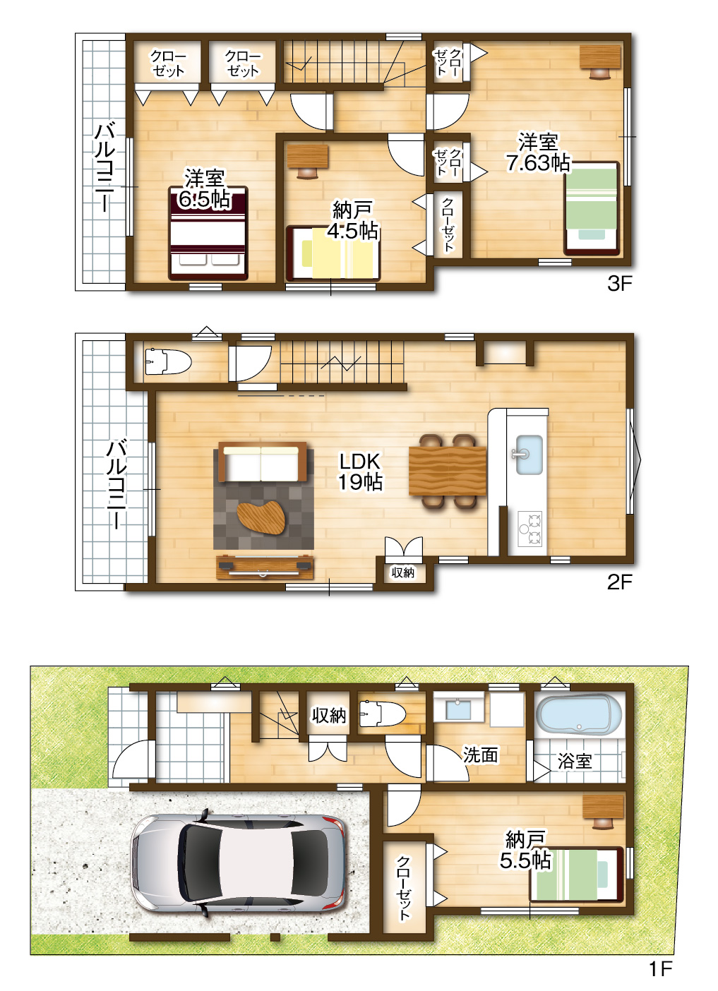 | 間取内容 | LDK20畳 2階 洋室7.63畳 3階 6.5畳 3階 5.5畳 1階 4.5畳 1階 納戸×2 |