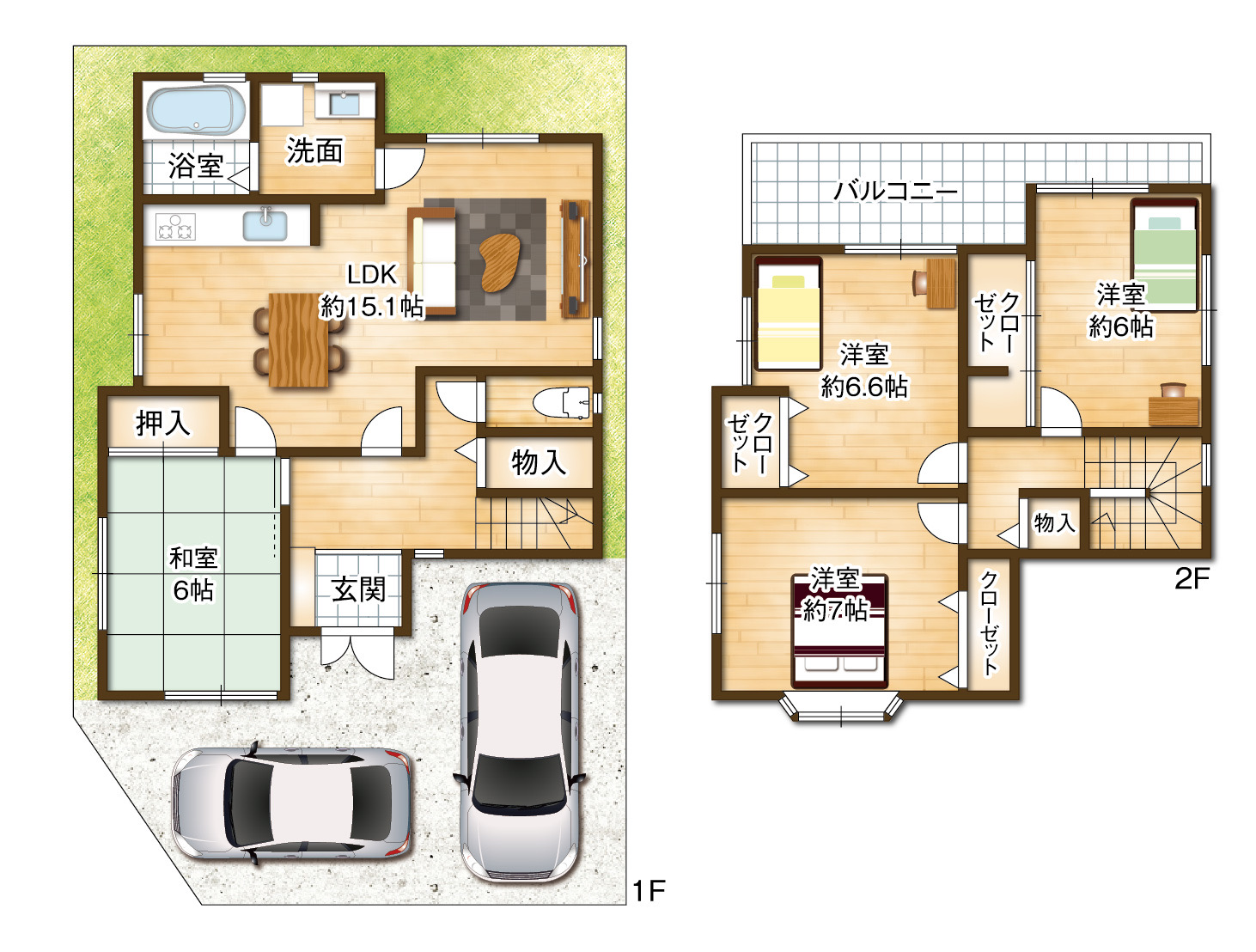 | 間取内容 | LDK15.1畳 1階 和室6畳 1階 洋室7畳 2階 洋室6.6畳 2階 洋室6畳 2階 |