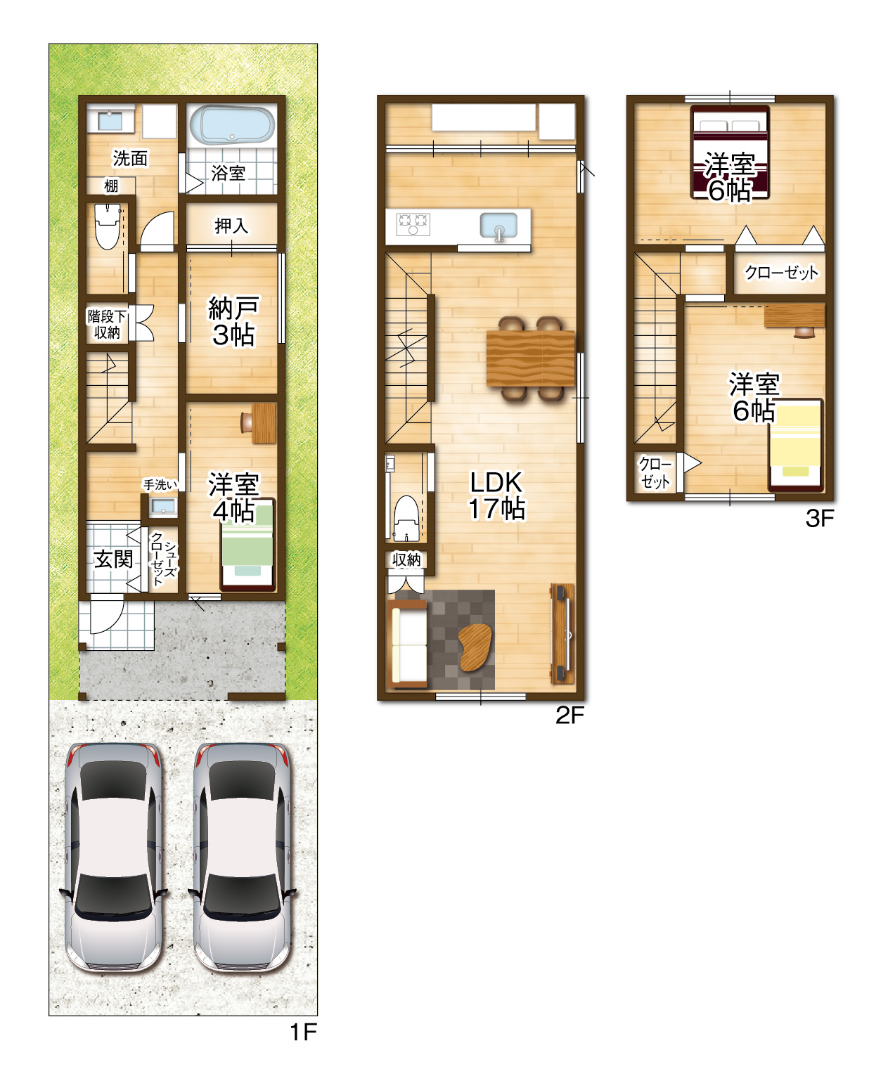 | 間取内容 | LDK17畳 2階 洋室6畳 3階 洋室6畳 3階 洋室4畳 1階 S3畳 1階 |